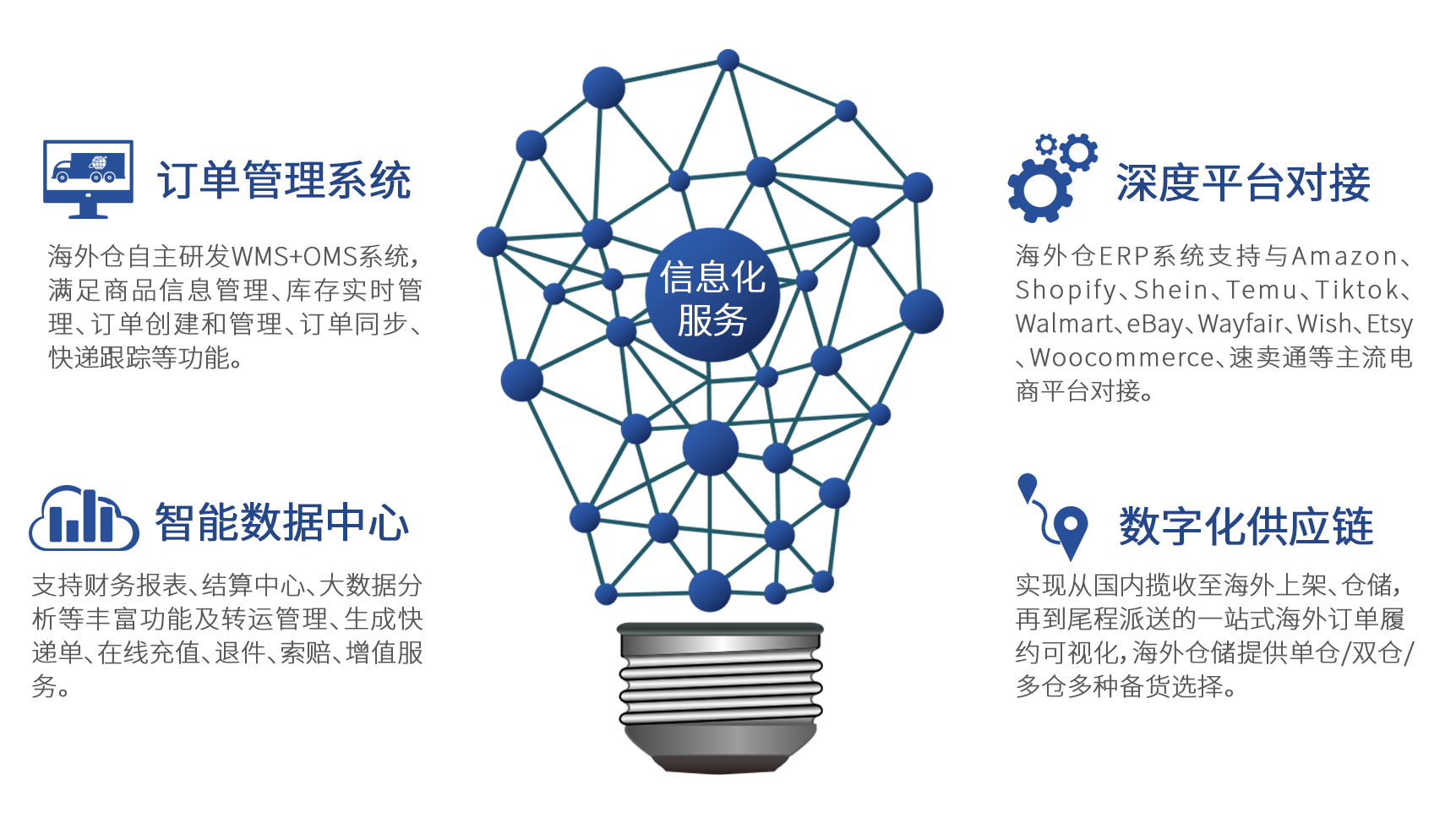 提供标准API接口,支持Amazon、eBay、Shein、Tiktok、Walmart、Temu、Shopify、Wish、Wayfair、速卖通等主流电商平台与ERP系统多平台对接,时刻关注和研究电商平台的政策变化,并及时调整我们的服务,适应平台标准的更新,真正实现线上销售与线下操作同步,用数据证明实力。